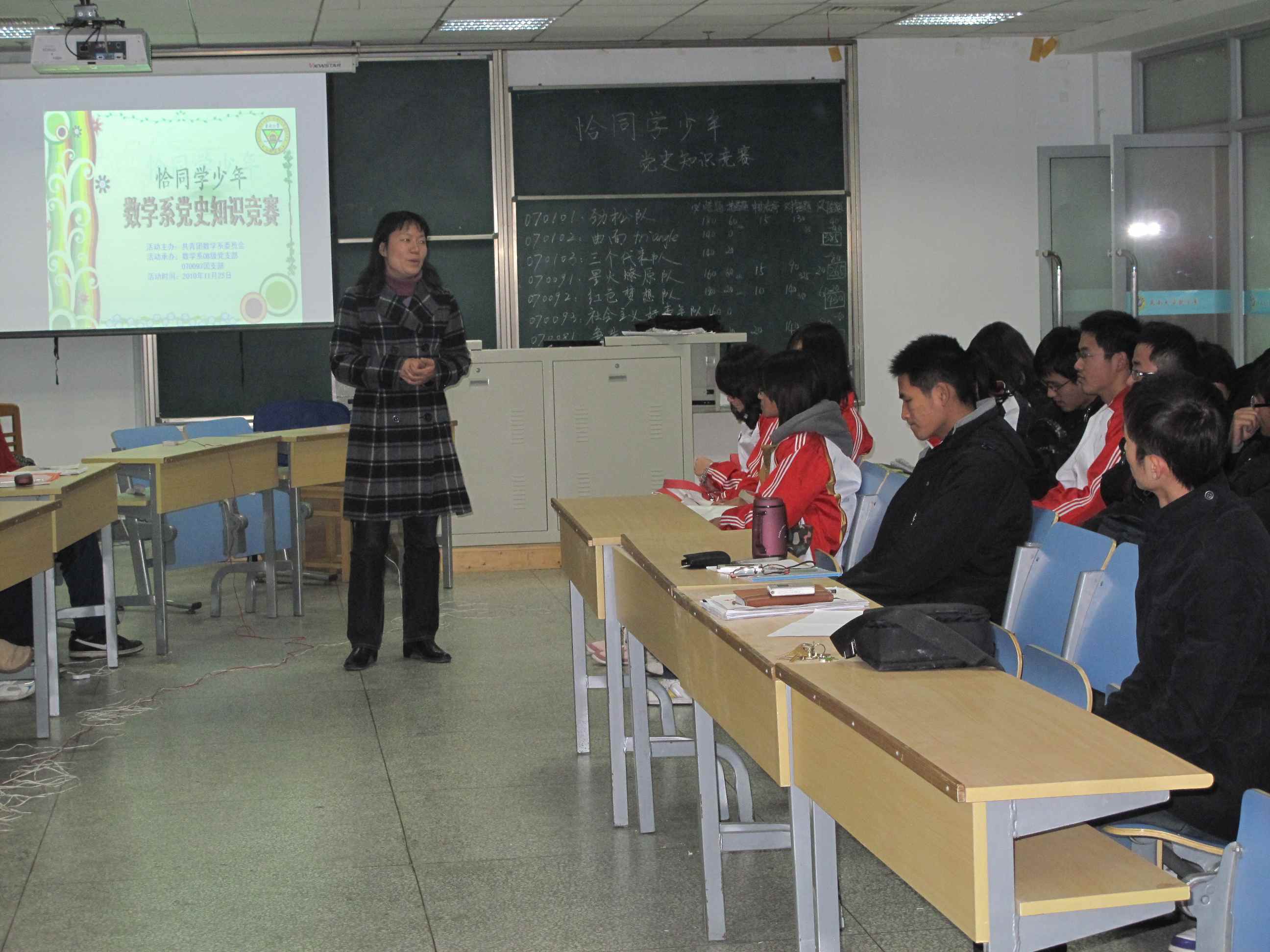 | 11月25日晚,数学系首届“恰同学少年”党史知识竞赛在图书馆数学系第二报告厅揭开了帷幕,尽管初冬的天气阴冷,但却无法抵挡同学们如火的热情,大厅里暖意融融。数学系党委书记宋晓燕,团委书记袁煜昶以及张涌教师也应邀出席。 在一段幽默诙谐的暖场视频后,比赛正式开始。参加比赛的是来自各个年级的入党积极分子,他们以支部为单位,共组成了8支代表队参与角逐。比赛由必答题、抢答题、判断题、风险题四部分组成。经过必答题和抢答题的紧张较量,有4支代表队顺利进入下一轮。 中场休息环节,四名代表分别介绍了党的先进分子事迹,同学们深深为党员的先进事迹所感染,他们热情的脸庞、坚毅的眼神,体现了他们向党的决心。 第三环节判断题过后,四队仍难分伯仲。比赛进入了最具戏剧性和挑战性的风险题环节,全场的气氛也达到了紧张的顶点,高得分伴随的高风险给比赛带来了极大的不确定性因素,结果,10级1班同学功败垂成,最后一题上的犹豫使他们与胜利擦肩而过。 最终,070092支部凭借稳健的发挥拔头筹。虽然比赛有输赢,但通过这次竞赛,同学们对我们党的历史和章程有了更深刻的理解,也很大程度上激发了大家的入党热情,而这正是本次比赛的宗旨所在。恰同学少年,风华正茂。相信比赛一定会越办越好,越来越多的风华青年将为党奋斗无悔青春! |