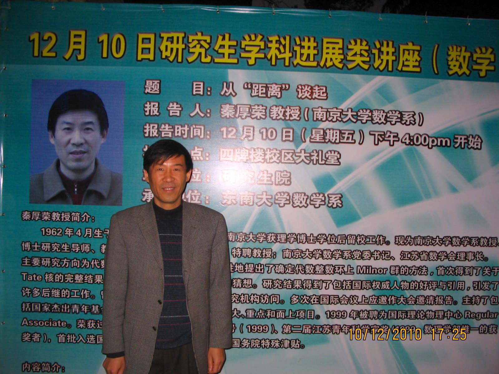 秦厚荣教授1962年4月生于江苏海安。1992年7月在南京大学获理学博士学位后留校工作。现为南京大学数学系教授、博士研究生导师、教育部“长江学者奖励计划”特聘教授;南京大学数学系党委书记、江苏省数学会理事长。主要研究方向为代数数论与代数K理论。创造性地提出了确定代数整数环上Milnor群的方法,首次得到了关于Tate核的完整结果,证明了多个长期未获解决的猜想。研究结果得到了包括国际权威人物的好评与引用,引发了许多后继的工作。曾先后赴欧美十多所高校、研究机构访问。多次在国际会议上应邀作大会邀请报告。主持了包括国家杰出青年基金在内的多项国家和省部级重大、重点和面上项目。1999年被聘为国际理论物理中心Regular Associate。荣获过“南京市十大科技之星”称号(1999)、第二届江苏青年科学家奖(1999,数理学部惟一的获奖者),首批入选国家“百千万人才计划”,享受国务院特殊津贴。