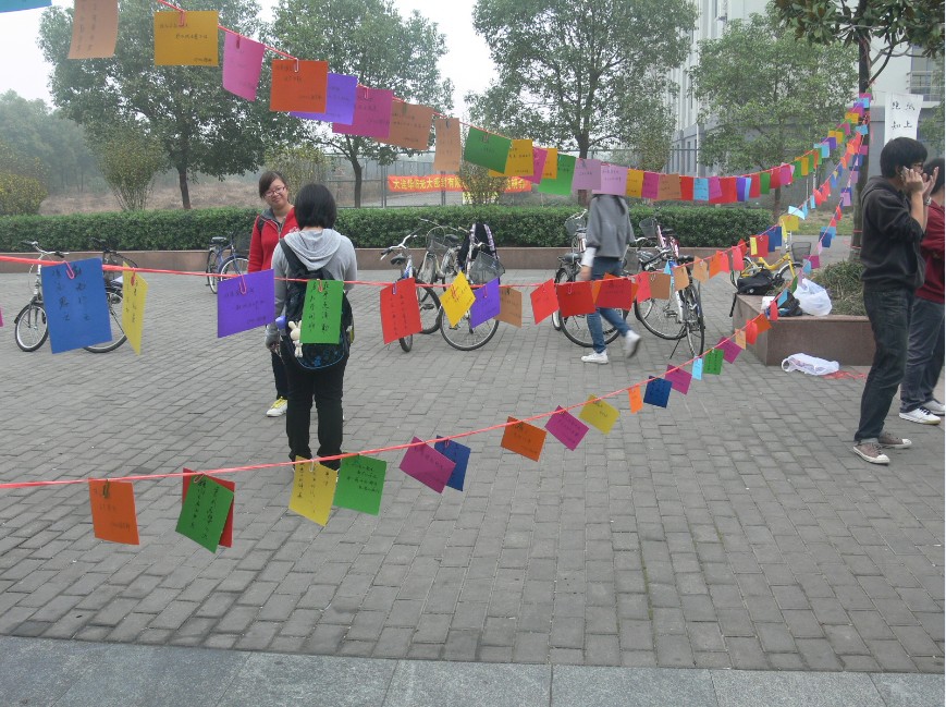 2011年11月18日中午,由数学系主办,数学系070102团支部承办“张扬大学生个性,弘扬校园文化”的在今年会官网九龙湖校区梅园食堂门口展开。 活动以“炫彩青春,魅力无限”为标语,号召大家在青春飞扬的年代活出自己活出个性。彩色纸点缀而成的展示墙以及由书画社的书法作品将记忆中的励志标语呈现在大家眼前,体现出我校独具特色的校园文化。长卷画轴环节以“轻染指间,手绘青春@20年少的我们”为主题。参与者亲笔绘画自己的所见所想所听所思,充分得展现了当代大学生的独特个性,也彰显了我们活动的主题“张扬大学生个性”。 活动突出了当代大学生独具的个性,同时联系校园,展现一下我们学校独特的校园文化!  |