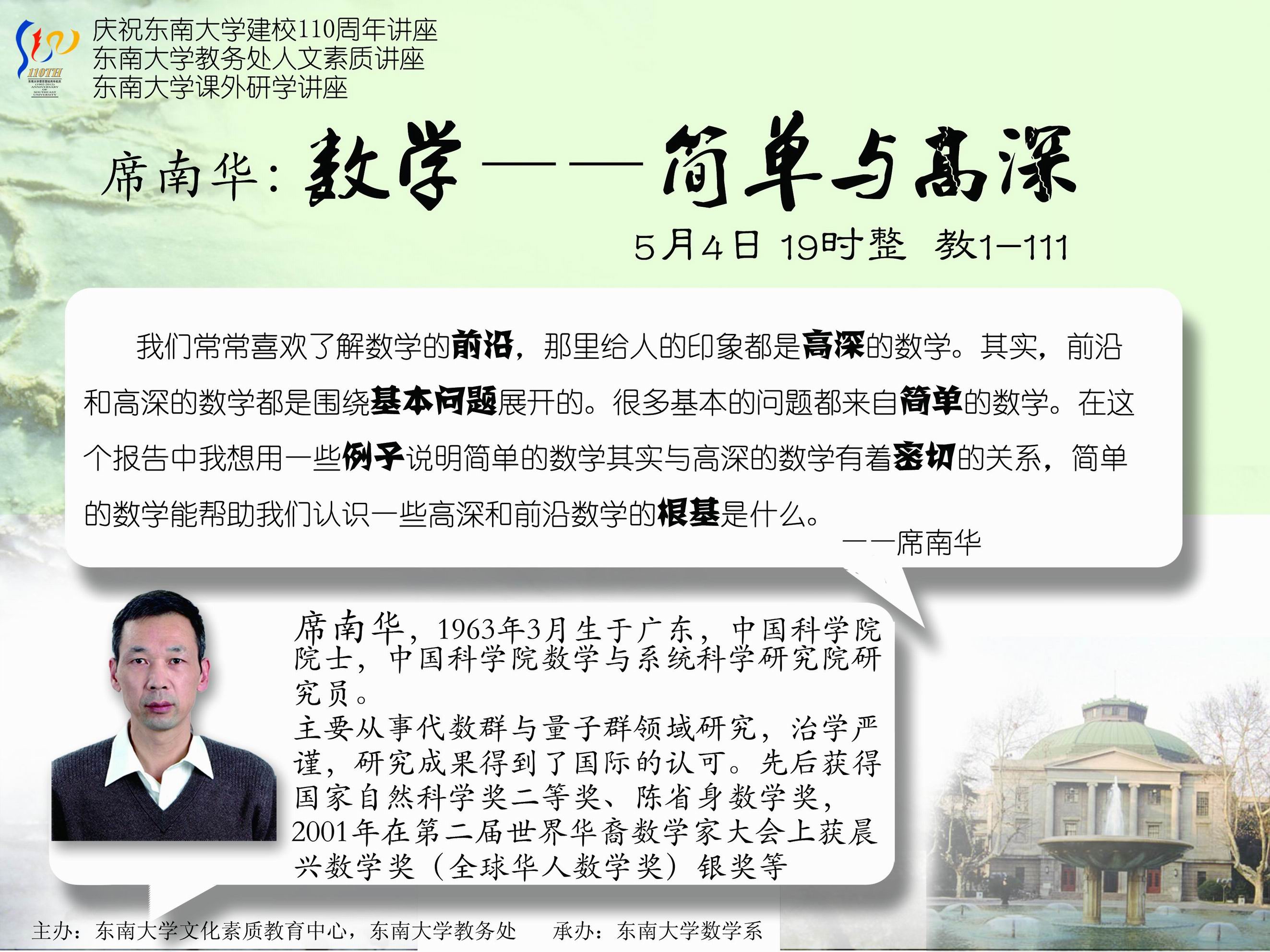 演讲人:席南华(中国科学院院士,数学家) 主 题:数学――简单与高深 时 间:5月4日(周五)晚19:00 地 点:九龙湖校区教一111 主 办:今年会官网数学系 今年会官网教务处 今年会官网文化素质教育中心 承 办:共青团今年会官网数学系委员会 备 注:该讲座已经列入“今年会官网课外研学讲座”系列和“今年会官网文化素质教育讲座”系列。 为庆祝今年会官网建校110周年,今年会官网数学系诚邀到了中国科学院院士,数学家席南华教授与东大学子分享关于数学的简单与高深。 我们常常喜欢了解数学的前沿,那里给人的印象都是高深的数学。其实,前沿和高深的数学都是围绕基本问题展开的。很多基本的问题都来自简单的数学。本次讲座中,席南华院士将用一些例子说明简单的数学其实与高深的数学有着密切的关系,简单的数学能帮助我们认识一些高深和前沿数学的根基是什么。机会十分难得,欢迎大家踊跃参加! 席南华院士简介 席南华,数学家,中国科学院院士,中国科学院数学与系统科学研究院研究员。1963年3月生于广东省英德,1981年毕业于湖南怀化师范专科学校(现怀化学院)数学科,1985年、1988年先后获华东师范大学数学系硕士、博士学位。 席南华主要研究代数群与量子群,对仿射A型Weyl群证明了Lusztig关于双边胞腔的基环的猜想,确定了Deligne-langlands关于仿射Hecke代数的猜想成立的充要条件,与Lusztig合作发现典范左胞腔,对量子群的基进行了系统的研究,这包括与Chari合作构造了量子群的单项基,计算了某些典范基,对根向量及其交换公式的研究等。 席南华曾获国家自然科学奖二等奖、陈省身数学奖等。1994年成为数学研究所研究员,同年获首届国家杰出青年基金. 2001年在第二届世界华裔数学家大会上获晨兴数学奖(全球华人数学奖)银奖。 席南华所从事的代数群与量子群研究是当前数学中的一个焦点领域,汇聚了一批世界知名的数学家,如美国科学院院士Kazhdan(Harvard大学),Lusztig(MIT)和Langlands(Princeton大学);Fields奖得主Deligne和Drinfeld;京都大学中岛(2002年国际数学家大会一小时报告人)等。在这样一个竞争异常激烈的领域,席南华通过自己的努力取得了一系列十分突出的研究结果。他对仿射A型Weyl群证明了Lusztig关于基环的猜想,成为国际上很多后续工作的基础之一,是对代数群理论的重要贡献。 此外,2007年席南华的另一项工作发表在国际顶尖数学刊物《美国数学会杂志》上(Journal of the American Mathematical Society,Volume 20, Number 1, 2007)。这是中国大陆学者首次独立在JAMS上发表论文。 2009年,席南华当选中国科学院院士。 |