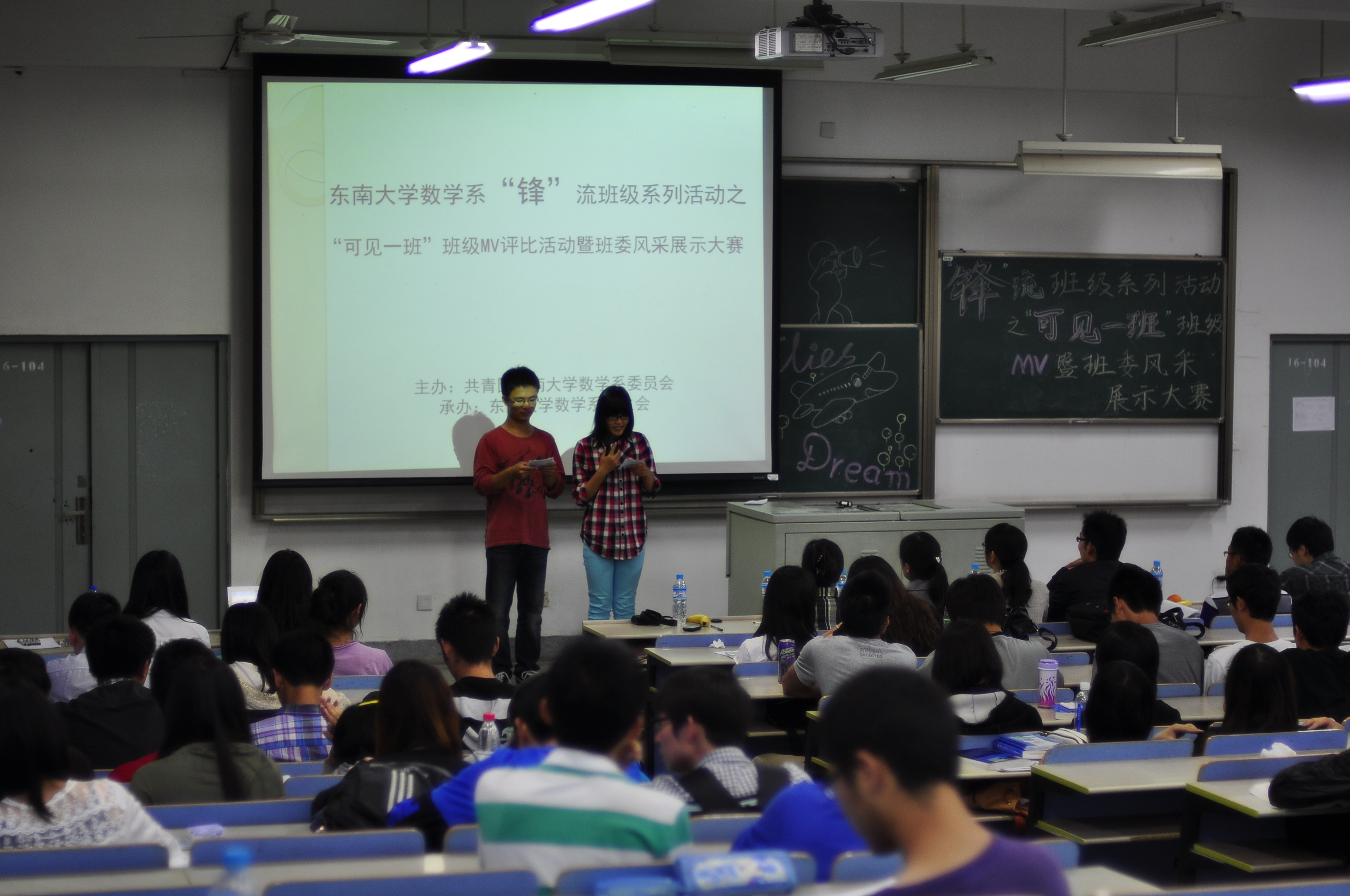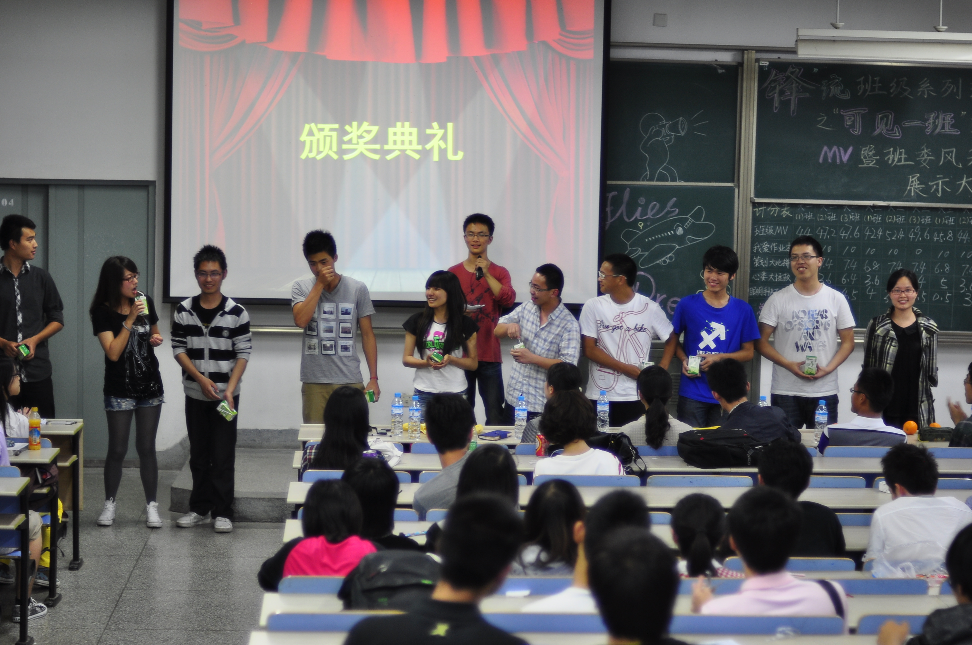 |     2012年5月15日,由数学系团委主办,数学系学生会承办的班级MV录制与特色展示评比――“可见一班”活动圆满结束。数学系团委书记袁煜昶,10级辅导员张涌,兄弟院系团委书记和辅导员焦伟、林琼、钱怡君等老师,出席了MV展示会并为获奖的班级颁奖。09,10,11级各班级通过近一个月的编排,导演,摄录,剪辑等精心准备,展示了一个又一个的活力四射且风格迥异的班集,此次MV摄录活动增强了各班同学的凝聚力,增进了同学之间的友谊。 班级MV活动是旨在提供一个展示各个班级特色与风采的平台。在各班收到活动通知后便积极开展了筹划工作,进行了剧本的设计和故事的构思。在之后的拍摄阶段,各个班级充分发挥了本班的特长,使用了多种多样的拍摄手法,达到了预定的拍摄效果。 5月15日晚上,“可见一班”MV展示现场比赛开始。同学们制作的MV逐一上台展示,每个MV都独具风格,有诉说迷失青年奋发图强的励志MV,有回忆当年同学情谊深四海的记录MV,有制造惊悚灵异的恐怖MV,还有轻吟校园爱情的小清新文艺MV等等。在每个班级选配的轻松愉快的音乐陪衬下,领略了09级同学的成熟与积淀,他们在MV中讲诉着甜美的回忆并憧憬着美好的未来,同时,也感受到10级同学们的活力和技术流,构思独特的校园恋情感人至深,还有另一部那意识流派的电影渲染效果,令人观后难忘,最后是数学系的新生力量,未来的中坚骨干,11级同学们的MV,有着灵异第六感的恐怖MV为带来了全新的视听体验,而另一部关于问题少年从游戏的苦海里找到一条去李文正楼的路的励志MV,也展示了11级同学学风向上的精神面貌。 在活动的间隙,班委技能大比拼也顺利进行,最后,综合了各班的MV制作以及班委比拼的结果,070102班获得了一等奖。本次MV比赛至此结束,但借这次MV比赛所展示的各个班级的凝聚,进取,活力远远没有停止,随着时间的慢慢发酵,它们也会成为如本次MV所展示的那样美好与永存。  |