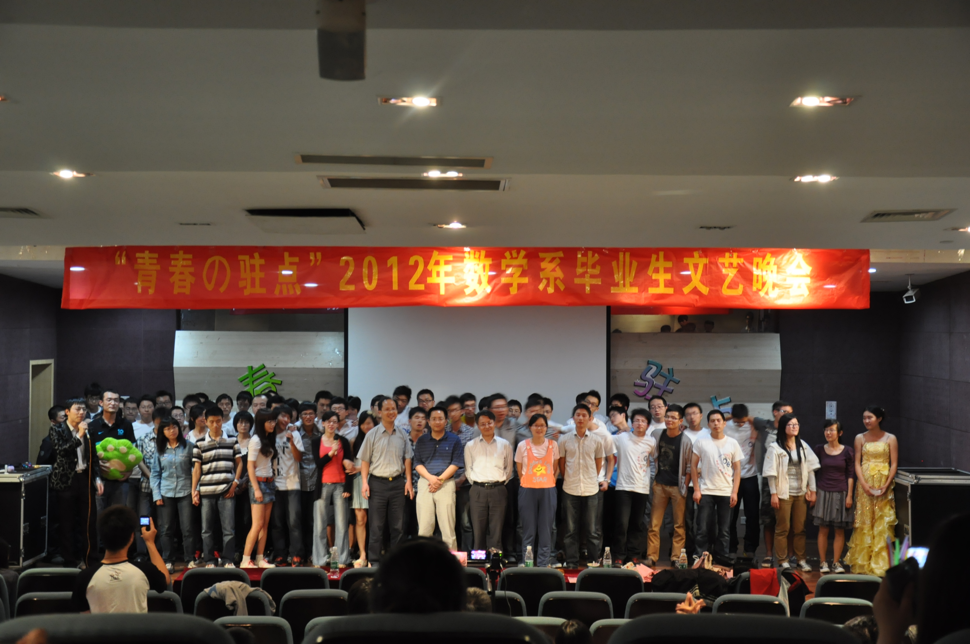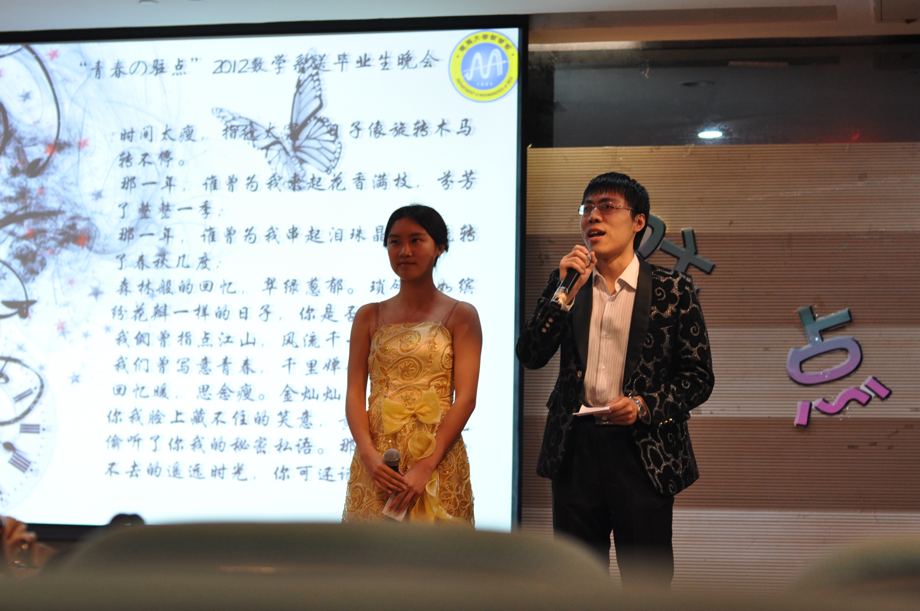 | 2012年5月22日19时, 数学系“青春の驻点”欢送2012届毕业生文艺晚会在焦廷标馆一楼圆形报告厅隆重上演并取得了圆满成功。数学系党委书记李涛老师、系主任刘继军老师、副主任薛星美老师,以及各兄弟院系的团委书记、辅导员老师们出席了本场欢送晚会。 晚会由一曲火辣的现代舞拉开序幕,之后有优美的歌曲独唱,甜蜜的双人对唱,深情又不乏幽默的朗诵等十多个节目。其中,大一大二合作带来的简短又让人捧腹的话剧《有雷无雨》和毕业生兼主持人的孙旭峥学长带来的的相声《本科特长生》台词精致,调动了整场晚会的气氛。晚会中主持人现场邀请了许多大四同学、领导和老师参与了互动环节,其中包括“你来比划我来猜”和“传递洋葱圈”的游戏。系团委书记袁煜昶老师和学办主任张涌老师的一曲《老鼠爱大米》深情对唱,令人捧腹,更把晚会推向高潮。同时另一边的人人墙上也是妙语连珠,为晚会增光添彩,活跃现场气氛。 毕业生两个班级的视频记录着2008级大学四年的笑脸和弥足珍贵的回忆,幽默搞笑又充满了温情与感动。最后,晚会在2008级全体毕业生上台齐唱《朋友》声中结束,他们一起欢呼,拥抱彼此,久久不愿离去。 毕业,留不住的是脚步,带不走的是校园情怀;毕业,忘不掉的是兄弟,放不下的感情。数学系“青春の驻点”欢送2012届毕业生晚会,取得了圆满成功,既凝聚了本届毕业生对东大对数学系浓浓的爱校爱系情怀,更集聚了学弟学妹对即将离校的学长学姐们的真诚深厚的祝福,祝他们前程似锦,一路顺风,早日实现自己的理想!  |