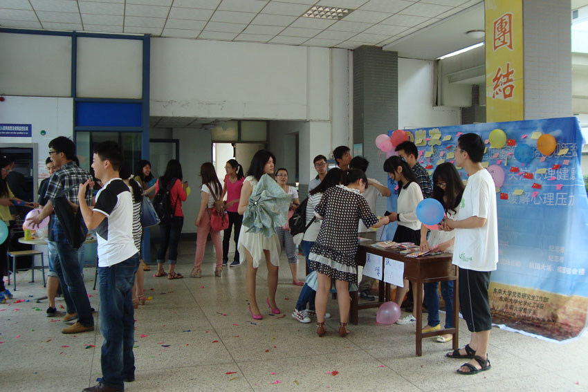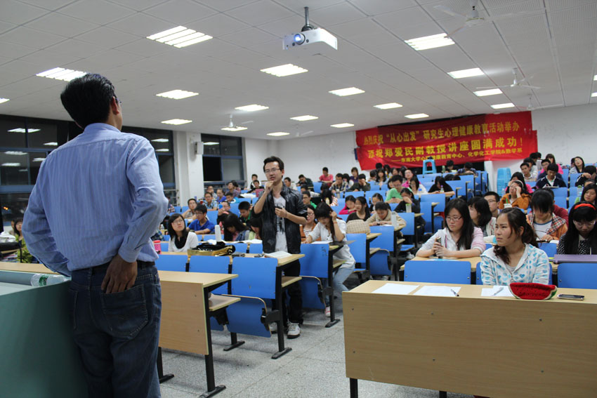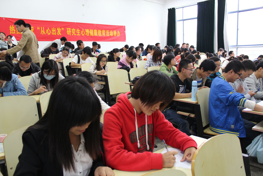| 2013年5月8日――5月24日,今年会官网 “从心出发”研究生心理健康教育系列活动得到圆满成功。本次活动由今年会官网党委研究生工作部、今年会官网化学化工学院、今年会官网数学系和今年会官网大学生心理健康教育中心主办,今年会官网化学化工学院研究生会、今年会官网数学系研究生会和今年会官网心理健康协会承办,旨在引导学生关注心理健康,培养积极心理,促进心智成熟。 本次心理健康活动以“关注心理健康 缓解心理压力”为主题,活动主要分为三个部分。 5月8日,我们在纪忠楼成功举办了心理测试活动。我们有幸邀请到了数学系党委副书记兼副系主任曹海燕老师、数学系团委书记袁煜昶老师、化学化工学院党委副书记兼副院长陆娟老师和化学化工学院团委书记梅震宇老师为嘉宾。本次活动主要分为心理知识简介和专业心理测试两个环节。首先主持人对抑郁自评量表(SDS)做了指导说明,同时介绍了抑郁焦虑存在的危害及问题,希望同学们高度重视自己的抑郁程度,及时调整自己。然后参加活动的学生认真填写了专业心理测试的问卷,并在主持人的指导下计算出自己的分数,根据分数等级了解自己的抑郁程度,及时的发现问题,解决问题。活动举办后反响热烈,为我们后期活动打下了坚实基础。 5月10日,我们有幸邀请到了中国药科大学郑爱民副教授在教学楼J2-209给大家上了一堂心理课,主题为“在压力下自由呼吸”。郑教授简单介绍了“WHO”身心健康的“三良标准”:良好的个性、良好的人际关系和良好的社会适应,然后重点讲了自我心理调节的三原则,现场同学和老师展开了激烈的讨论,郑教授也耐心的解答了同学们的疑惑与问题。两个小时的讲座,郑教授幽默风趣、知识渊博,赢得了同学们的阵阵掌声和喝彩,全场氛围热烈欢畅。 5月24日,我们在橘园大厅成功举办 525心理健康活动,主要通过两个游戏的方式来缓解学生的压力。第一个游戏是“战胜困难 释放心理压力”,具体的活动形式是:参加活动的同学将烦恼写在气球上,并使劲打气球,直到把气球打爆。该游戏的寓意是战胜困难,打倒烦恼。第二个游戏是“艺术表达 分享你我真情”,具体的活动形式是:参加活动的同学在便利贴上写下你的心情或困扰的问题或者是对他人的祝福,让其他的同学跟你一起分享或是帮你解决问题。该游戏的寓意是分享真情,共同承担。虽然今天酷暑难耐,但同学们积极参加,现场活动相当热烈! |