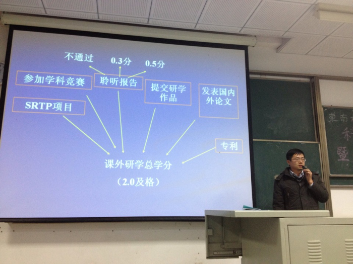 2013年12月5号,在J4-104,数学系科协成功举办了“课外研学工作指导”宣讲会,本次大会有幸邀请到了课外研学负责人王小六老师来给同学们做工作指导。王老师给同学们详细地介绍了今年会官网课外研学和srtp的内容,为同学们在大学学习中能更好的顺利完成学业做了准备。 首先,王老师简单介绍了课外研学,同时为学生详细介绍了获取课外研学学分的五个途径:(1)参加srtp项目;(2)聆听学术报告撰写论文;(3)参加学科竞赛;(4)在国内外重要期刊上发表论文;(5)有未纳入srtp项目的研学作品,并且分别对这五个项目获取研学学分的分值,获取规则和明细步骤均作了说明。然后,王老师重点介绍了srtp。分别从srtp的内容、类别、申报地点、申报流程项目大致过程、项目结题要求以及参加或立项srtp的规则这七个方面对srtp做了全面介绍,并且还给同学们提了一些有用的建议,使同学们不仅对srtp有了清楚了解,也对自己参加srtp项目有了明确的指路灯。 在会议结束之时,王老师还给了教务处实践教学科和他本人的联系方式,为同学们能够进一步了解课外研学和srtp项目提供了途径。同时,数学系科技协会也将为同学们提供课外研学和srtp立项等相关事宜的全方位的信息服务。 |