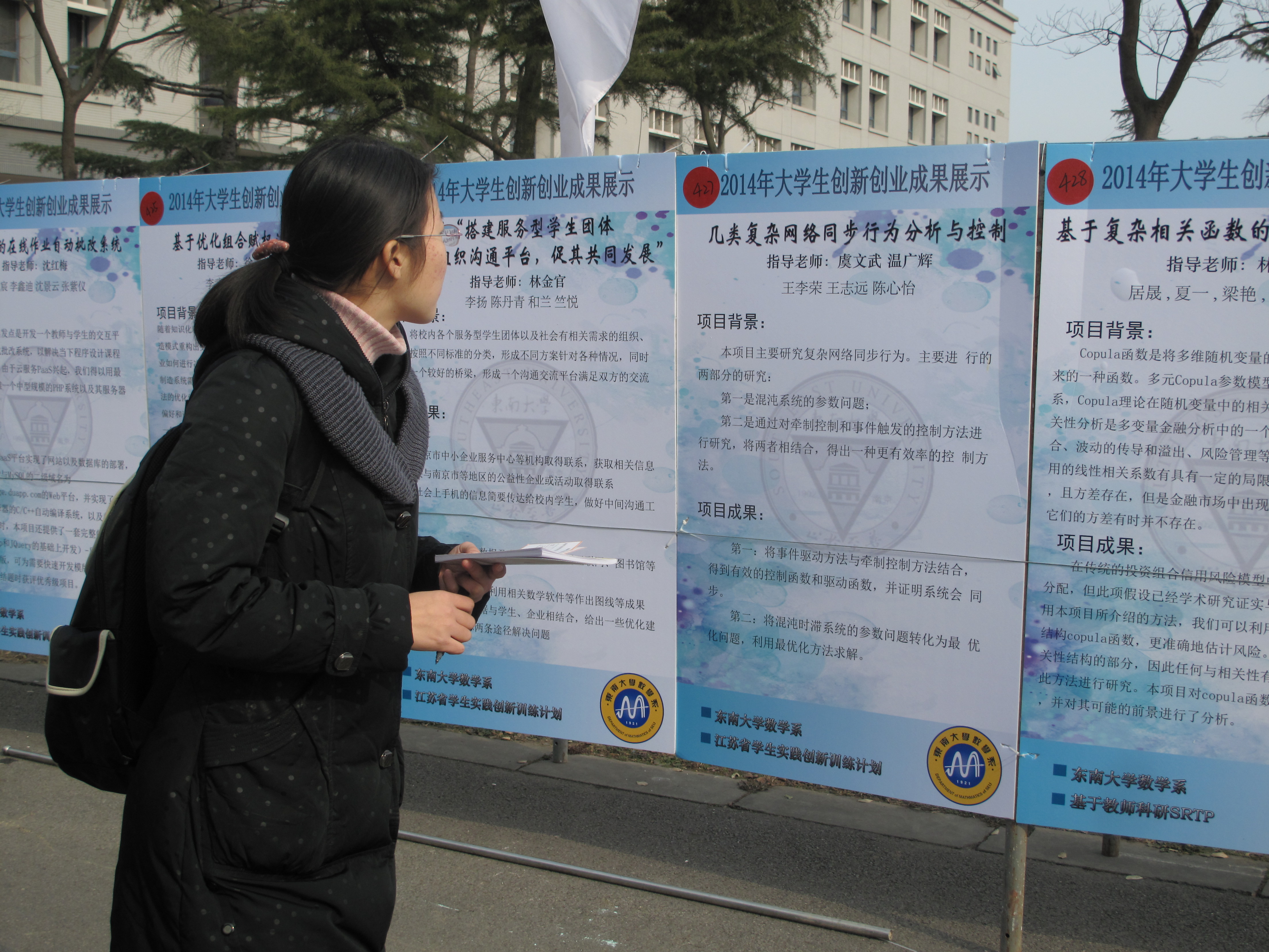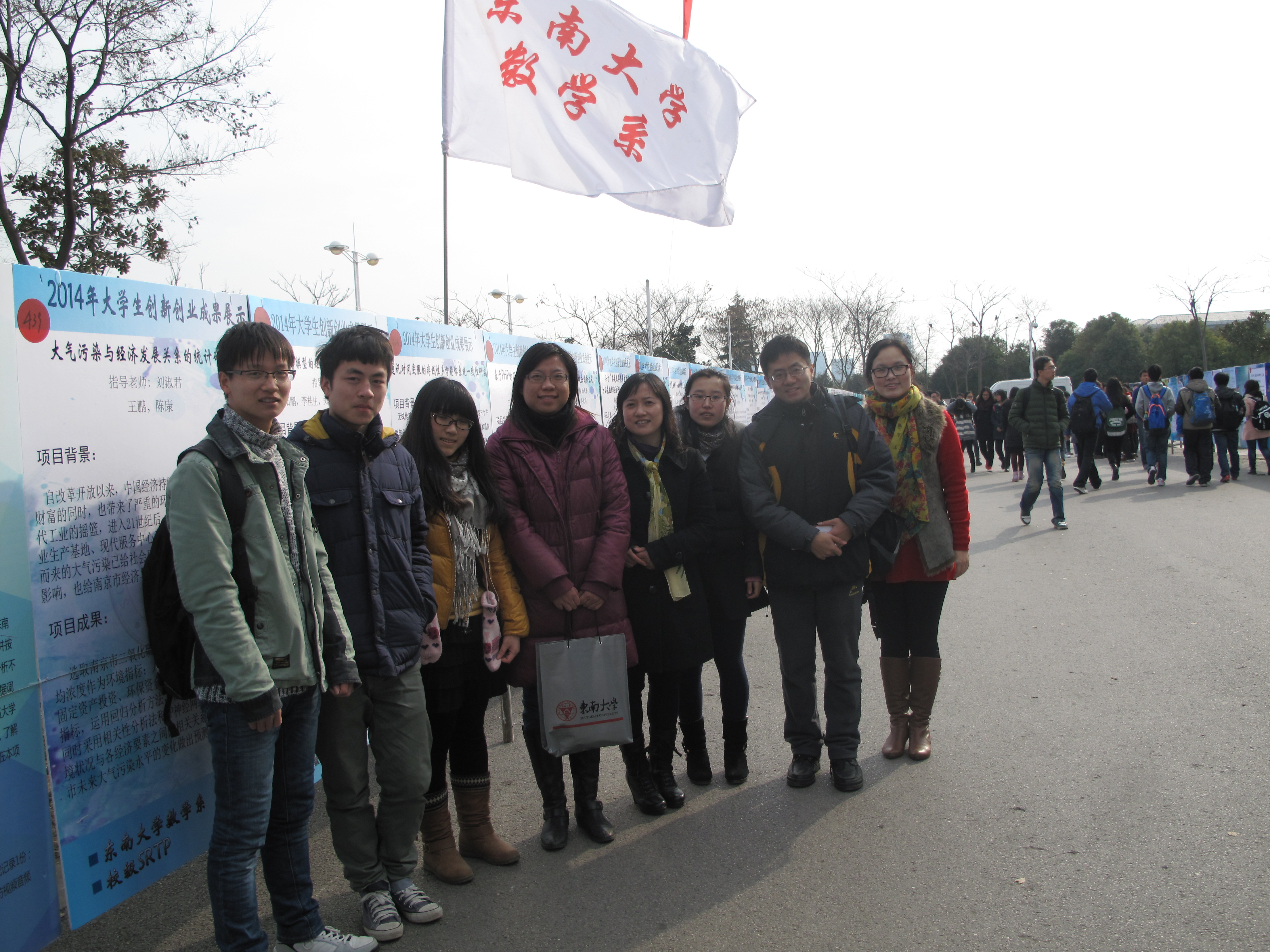 | 12月26日,今年会官网“第九届大学生创新创业成果展示会”在九龙湖校区如期举行。校党委副书记兼副校长刘波、副校长郑家茂、江苏省教育厅高教处副处长王兵,学校各有关部门负责同志、指导教师代表和学生代表等参加了展示会开幕式。开幕式由教务处处长雷威主持。 数学系系主任曹进德教授、党委副书记曹海燕老师、课外研学负责老师王小六老师和辅导员老师们参加了本次成果展。展示会上,数学系共展出成果展板18块,编号422-439,是近几年来展出数量最多的一年。这些展板按项目来源可以分为国创、省创、基于教师科研srtp以及校级优秀srtp。项目内容多样,有理论研究,例如陶为润小组的“偏微分方程的定性研究”;有具体应用,例如王鹏小组的“大气污染与经济发展关系的统计研究”;此外还有理论与应用,例如闫建璐小组的“二元极值模型的态密度估计及其应用”等。 展示会上,我系同学纷纷来到展示会现场驻足观看,我系自己的展板和来自全校各个院系的形式多样的成果展板或实物。展示会仪式结束后,我系党委副书记曹海燕、王小六老师、黄性芳老师、袁煜昶老师等与同学们合影留念。 据悉,本届展示会共展示作品及项目成果478件,其中实物105件,主要包括2014年已经结题验收的国家级、省级大学生创新训练计划项目,2013年和2014年基于教师科研的SRTP项目、校级SRTP项目,以及在各级各类学科竞赛中取得优秀成绩的作品等。另外,此次展示会还邀请了上海交通大学、同济大学、浙江大学、南京大学、南京航空航天大学、南京邮电大学等高校的13件优秀作品参展。展会期间,同学们现场投票评选出了“我最喜爱的20件作品”,并由专家评选出了优秀作品。 这次展示会共持续三天,既是对参展项目同学创新精神与实践能力的肯定和表扬,也是对广大学子的鞭策与激励,更将广泛、深入地推动我校本科生开展科技创新活动,希望通过展示会,点燃同学们的创新激情,激励更多的同学走上创新创业之路,成为国家社会经济发展所需要的卓越人才。 |