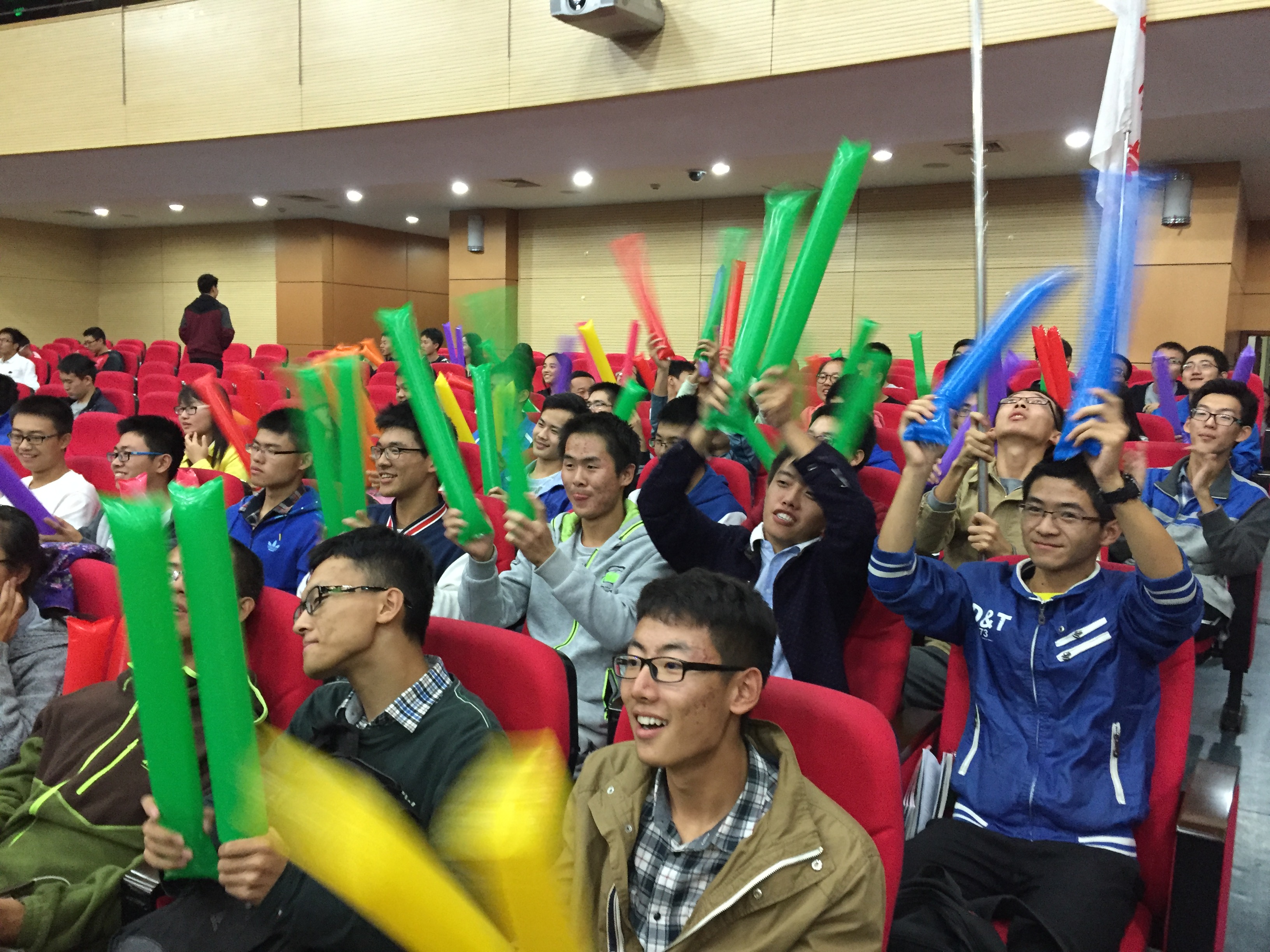 届时,校团委和各院系领导应邀出席了本次活动。数学系党委副书记曹海燕老师、团委书记袁煜昶、团委副书记陆妍蓉老师,与六十名同学代表在现场一起为我系参赛选手加油助威。虽时值瑟瑟深秋,但会场内全程洋溢着热烈的气氛。经过军训期间初赛的角逐,共有八支院系代表队脱颖而出。在开场参赛队伍介绍中,数学系、吴健雄学院、法学院、人文学院、机械工程学院、电子科学与工程学院、自动化学院和外国语学院八支队伍都完美展示了各自的风采,活跃了气氛。