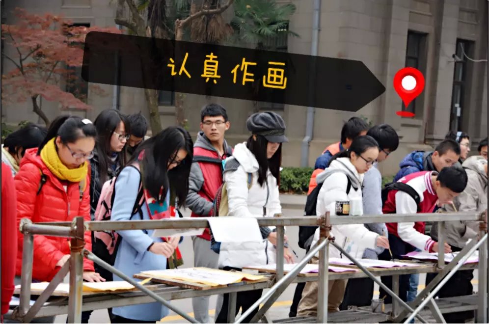 10时,在领略四牌楼的风景美之后,我们来到了大礼堂前开始准备现场作画。拿起毛笔,同学们神情专注地捕捉着四牌楼的每一个角落,精准地描绘着眼前的美丽。很多平时低调的同学也大显身手,一展风采,让我们不禁感叹,东大真是藏龙卧虎、人才济济。经过参赛者半个小时的用心作画,一幅幅生动形象、栩栩如生的水墨画,酣畅淋漓、遒劲有力的毛笔字纷纷而来。女生的画细致入微,男生的画势气磅礴。一幅幅作品彰显了我们对水墨画的热爱,这是青春活力的画卷。