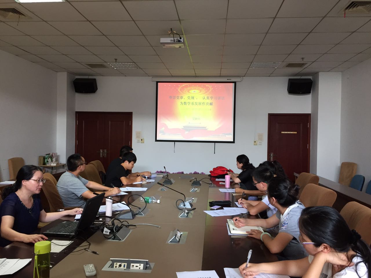 为进一步深入开展党员“两学一做”学习教育活动,8月25日,数学系党委在九龙湖校区数学系会议室召开了新学期第一次党支部书记会议,会上,系党委吴映红书记按照学校对“两学一做”学习教育活动的要求,带头讲党课,作了题为“尊崇党章、党规,认真学习讲话,为数学系发展做贡献”的“两学一做”学习教育专题党课,数学系全体党支部书记参加了会议,并认真学习党课内容。