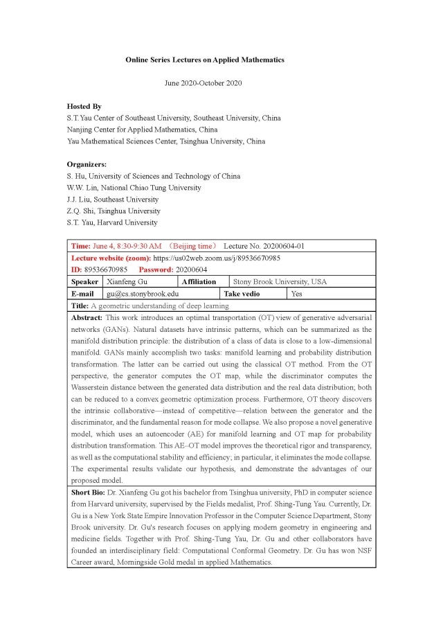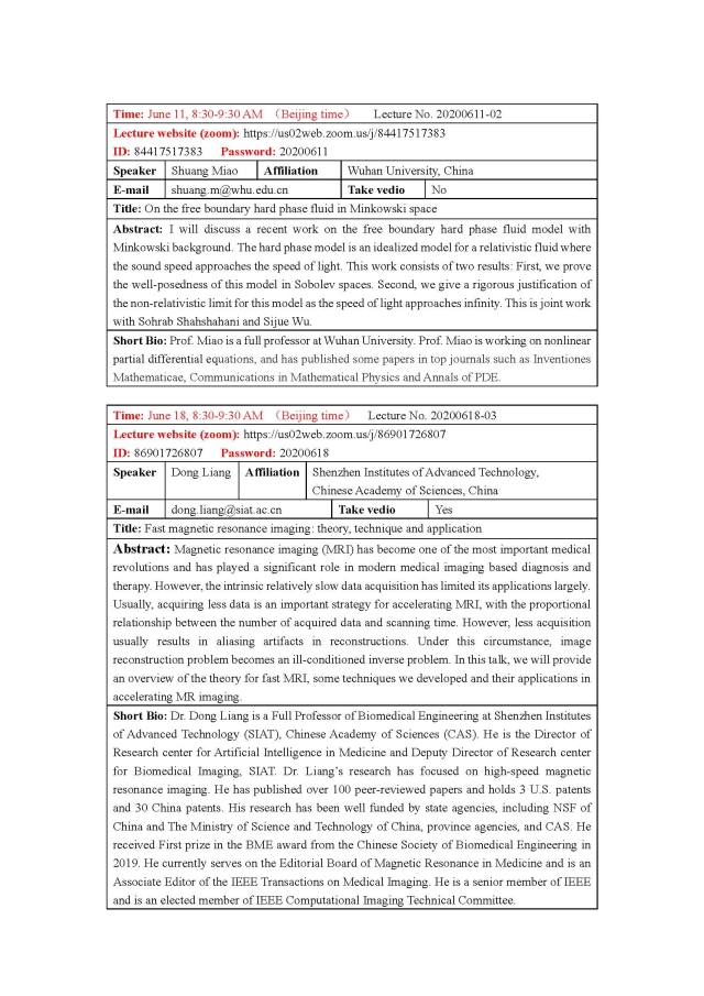 学术报告:2020年6-10月,Stony Brook University, USA-Xianfeng Gu,Wuhan University, China-Shuang Miao,Shenzhen Institutes of Advanced Technology-Dong Liang,RICAM Austrian Academy of Sciences, Austria-Mourad Sini