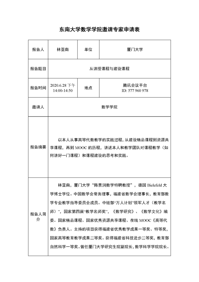 学术报告:2020年6月28日14:00-16:50,高等代数论坛