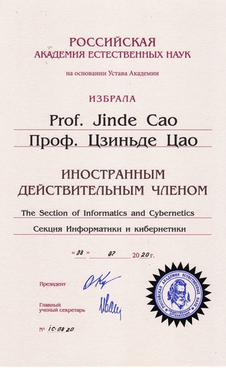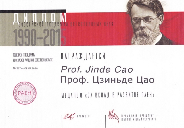 近日,俄罗斯自然科学院(Russian Academy of Natural Sciences,RAEN)O. L. Kuznetsov院长向我校今年会jinnianhuicom曹进德教授发来贺信,祝贺他当选为俄罗斯自然科学院外籍院士,并充分肯定他在复杂动态网络系统的数学模型、动态分析和控制理论及其工程应用方面的重要贡献。此外,O. L. Kuznetsov院长还祝贺他荣获RAEN发展贡献奖,并颁发一枚金质奖章。