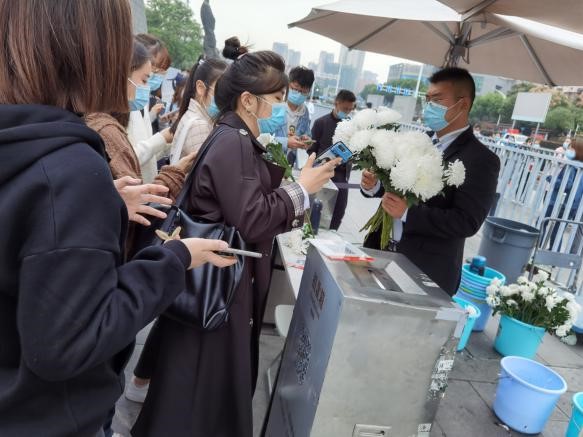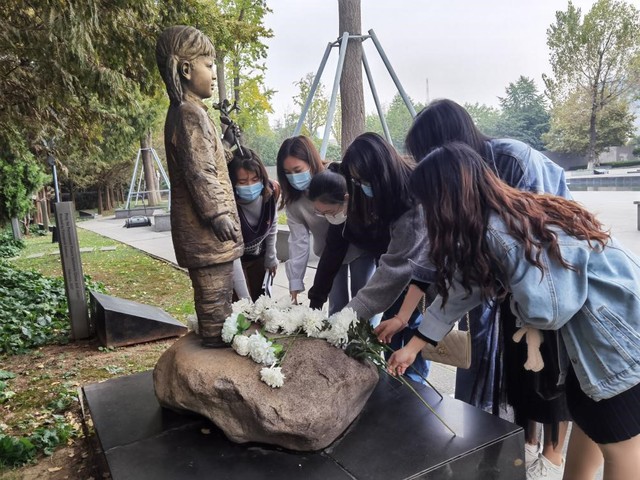 大家带着沉重的心情走出纪念馆,脑海里还一直浮现着无数同胞被残暴的侵华日军杀害的景象。大家把手中的菊花献给已故的同胞,以慰藉他们曾经遭受的难以想象的苦难。