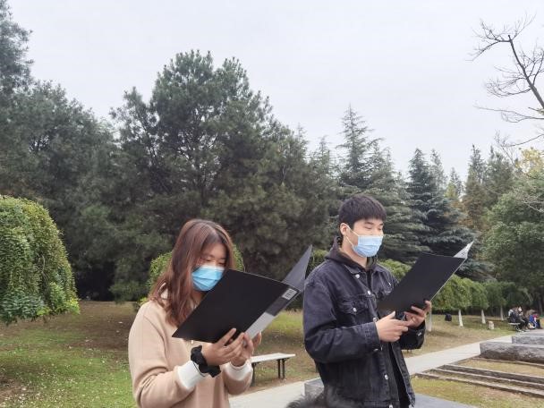 参观完纪念馆,支部成员一起来到和平广场,在此开展“诗朗诵和知识问答”活动。秦绪谱同志和葛杉杉同志朗诵了《山河之祭》。一字一词一句,无不揭示了日本侵略者在南京所犯下的滔天暴行。
