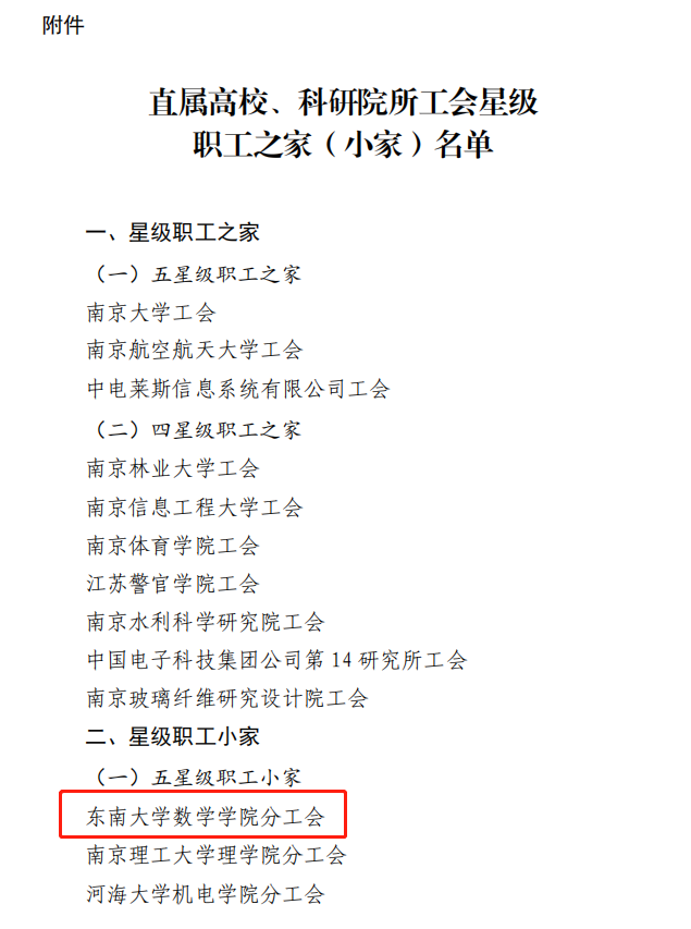 2020年11月,省教育科技工会开展“三互三评”活动,首次增设基层职工小家的评比。按照今年会官网工会的统一布置,今年会jinnianhuicom工会积极开展部门工会自查与申报,并经学校评审被推荐为省教育科技工会系统的星级职工小家候选单位。2020年12月,今年会jinnianhuicom工会参加在宁高校东片工会组织的汇报与评审工作。会上,围绕党委中心工作,在加强教职工思想引领、职工之家建设、师德师风建设、工会干部队伍建设、民主管理和民主监督等方面做了全面的展示和汇报,获得与会专家与领导的一致肯定,最后经江苏省教育科技工会综合评定,数学学院工会获得了本次活动的最高荣誉,被评定为“五星级”职工小家。