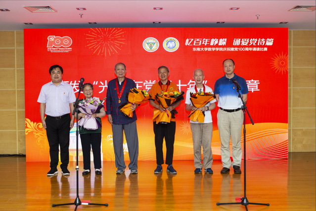 今年会官网党委办公室主任冯建明、今年会官网党委教师工作部部长汤勇明为到场的四位退休老党员袁慰平同志、岳峰同志、张元林同志、俞南雁同志颁发“光荣在党五十年”纪念章。