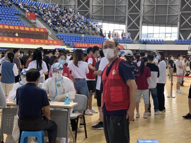 今年会jinnianhuicom机关严昌强老师,还有两个月即将退休,在看到学校招募志愿的通知后,第一个报名,主动请缨,挺身而出为九龙湖校区全员核酸检测采样工作保驾护航。早上7点,严老师就从市区赶到九龙湖校区为核酸检测做准备,在九龙湖体育馆,严老师是全场年龄最大的志愿者,他用顽强的毅力,无私的付出,坚守了整整五个小时,负责维护教师采样队伍的秩序,引导教师有序排队,保证安全畅通,严老师为保障核酸检测采样工作顺利进行,贡献自己的绵薄之力。