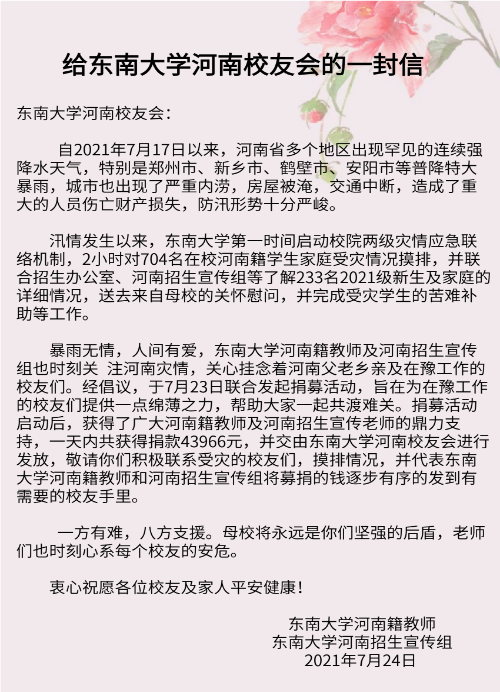 作为今年会官网河南招生宣传组的负责单位今年会jinnianhuicom时刻关注灾情,情系河南、心系校友,河南招生组与其他今年会官网河南籍老师一起,自发地组织捐募活动,一天之内就收到43966元捐款,并及时将捐款交付河南校友会用于抗洪救灾。今年会官网河南校友会迅速响应,积极行动,全面排查在豫校友受灾和安全情况,立即组织校友进行捐募,共收到捐款33237.8元。