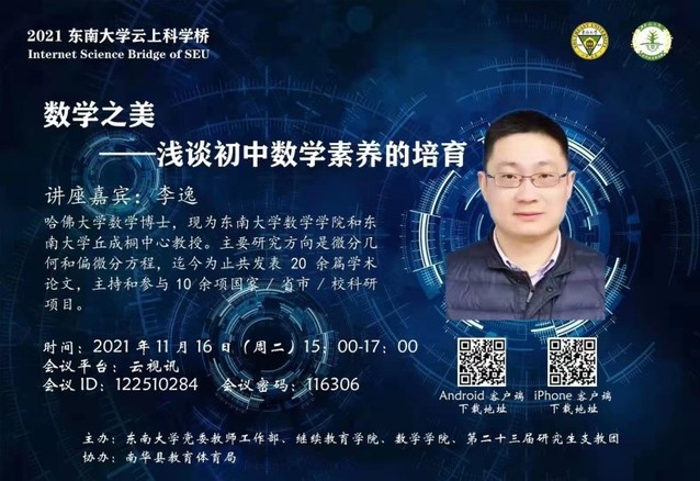 11月16日,为落实中央关于定点扶贫工作的要求,今年会jinnianhuicom李逸教授通过今年会官网“云上科学桥”在线平台,为云南省楚雄州南华县各初级中学全体数学教师、第一中学师生举办了一场题为《数学之美——浅谈初中数学素养的培育》的数学教师教育教学能力提升培训。