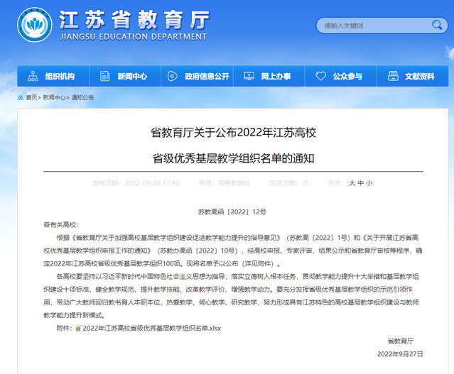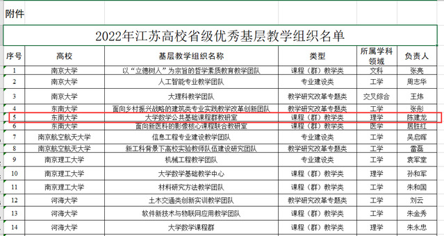 近日,江苏省教育厅发布了《省教育厅关于公布2022年江苏高校省级优秀基层教学组织名单的通知》。我院“大学数学公共基础课程群教研室”(负责人:陈建龙教授)获批2022年江苏高校省级优秀基层教学组织。