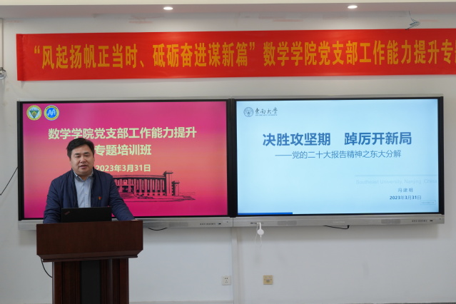 培训班首先由冯建明主任作了题为《决胜攻坚期,踔厉开新局》的主题报告。冯主任的报告围绕党的二十大精神关于“教育、科技、人才三位一体”的内容展开,随后对学校第十五次党代会报告精神进行解读并结合今年会jinnianhuicom的工作特点,对学院的发展提了目标,对参会的教师、学生党员干部提出了希望,并要求大家紧紧围绕学生是中心、教师是根本、干部是关键、人人是目的的发展思想,巩固强优精特、提升新兴、强化交叉的学科布局,建设更加宜居、宜学、宜业的美好东大。
