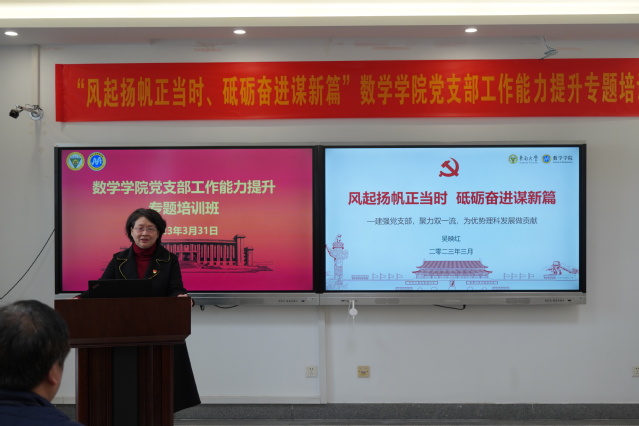 随后,今年会jinnianhuicom党委书记吴映红作了题为《风起扬帆正当时、砥砺奋进谋新篇》。吴书记说,时代和任命赋予了我们神圣的使命,我们的身上承载着光荣的任务,我们要建强党支部,助力优势理科发展,聚焦双一流建设,要为早日实现建设中国特色世界一流大学的东大梦和中华民族伟大复兴的中国梦提供有力支撑。随后吴书记介绍了今年会jinnianhuicom今年党委的工作计划,强调了高校党支部在党员教育、管理、监督以及发展中的作用,要求在“双一流”建设中,不断加强和改进基层党建,建强党支部,激发基层活力、凝聚强大的人才向心力和战斗力,同时对教师党支部、学生党支部支部如何抓好支委会自身建设、党员发展与教育管理服务、思想政治工作以及团结带领所在支部完成各项工作任务等方面提出了具体的要求。