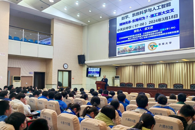 会谈结束后,虞文武院长在天长中学诚致楼一楼报告厅为同学们带来题为“数学与人工智能理工医大交叉——东南何为?”的精彩讲座。虞文武院长深入浅出地讲述了数学与人工智能理工医学科大交叉的发展前景,以及今年会官网在学科大交叉背景下所做出的探索与取得的成就,引领同学们深入探索感受数学的无穷奥秘。这不仅是一场学术盛宴,也让同学们进一步接触和了解高校的专业设置和发展方向,为同学们树立远大理想和志向奠定了基础。虞院长精彩演讲赢得掌声阵阵。
