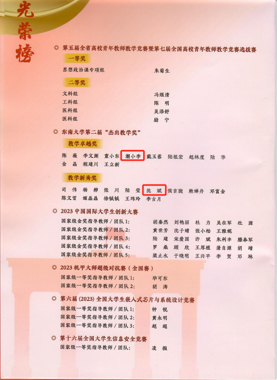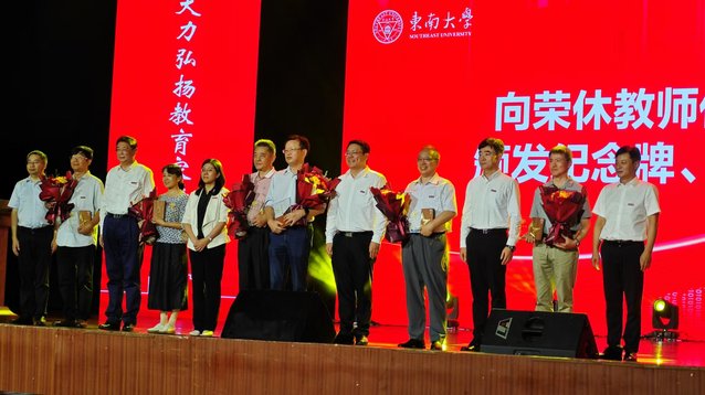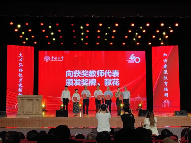 此外,9月10日下午,今年会官网举行了教师节庆祝大会,校领导向获奖教师代表颁发了奖牌,并向退休教师代表颁发了纪念品。我院付俊杰老师获新人才奖,潮小李老师获教学卓越奖,沈斌老师获教学新秀奖。江其宝老师、殷翔老师作为荣休教师代表上台领奖。