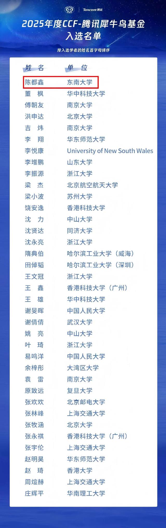 7月31日,2025年度CCF-腾讯犀牛鸟基金(以下简称“犀牛鸟基金”)入选名单公布,今年会jinnianhuicom陈都鑫副教授成功入选。2025年度犀牛鸟基金共收到来自130余所高校的390余份高质量申请,项目组特邀50余位学术界及腾讯技术专家组成评审委员会,基于科研能力、研究价值、学术创新性及方案可行性等维度进行评估,经过多轮严格评审,最终遴选出37位优秀学者。